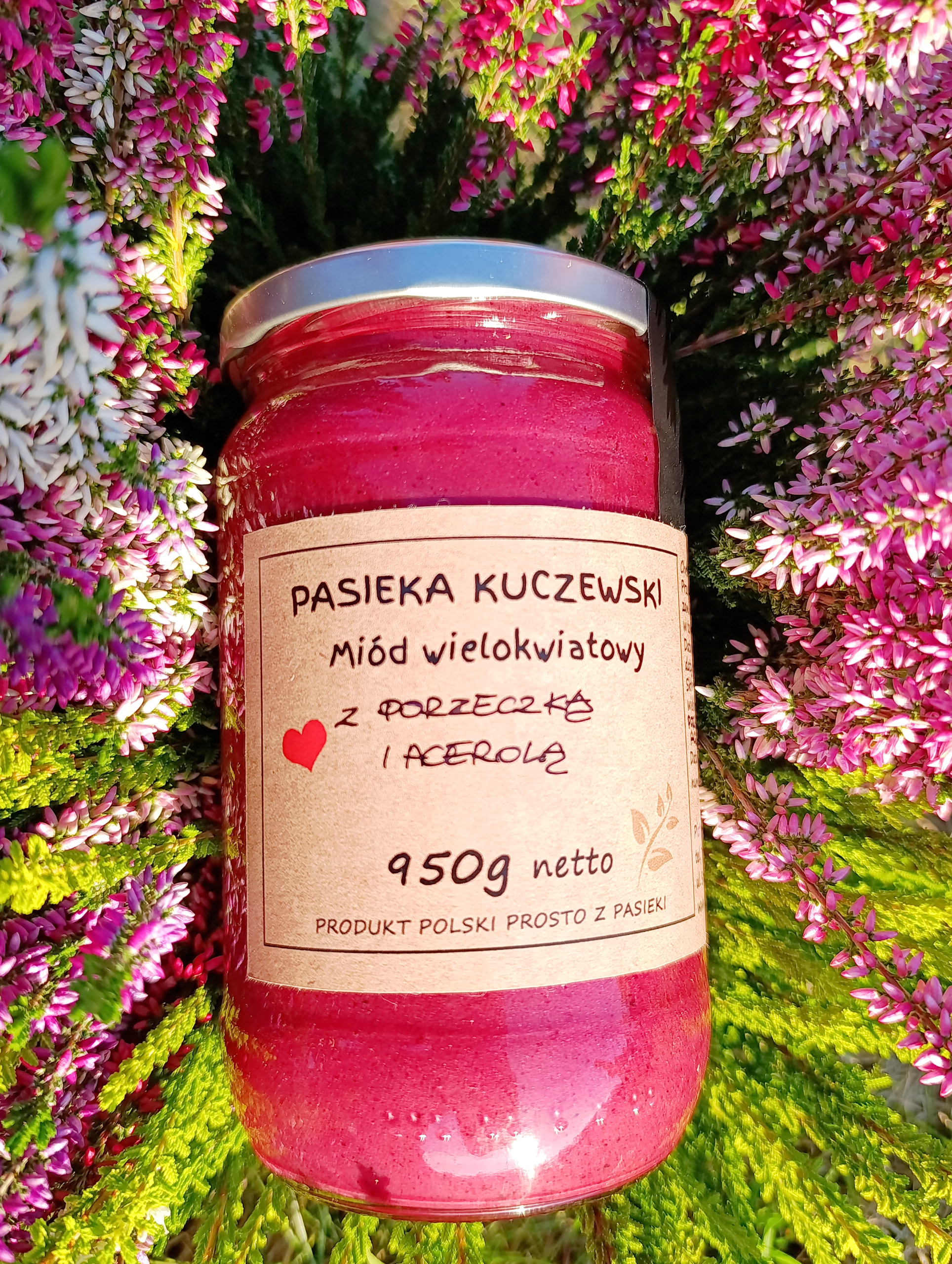 Miód wielokwiatowy z dodatkiem czarnej porzeczki i aceroli. Pyszny, lekko kwaskowy i bogaty w witaminę C.